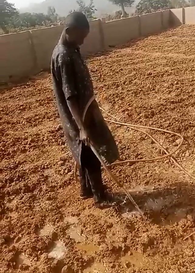 person watering a large plot of plowed, muddy land. The person is wearing a dark, patterned shirt and pants, and sandals, standing in muddy areas as they water. They are holding a long, beige hose and directing the water onto the dry dirt. The plot is bordered by a short, tan-colored wall on one side, with trees and distant hills visible in the background under a hazy sky. The overall scene suggests agricultural work or land preparation in a rural environment.