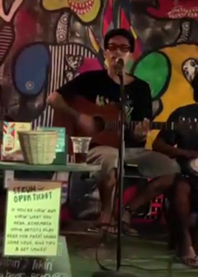 A man with short black hair and glasses, wearing a black t-shirt and tan shorts, sits on a stool playing an acoustic guitar and singing into a microphone. Next to him on the right is a second man with short black hair who is playing a drum, seated on a stool. A small table is to the left of the first man with a straw basket on top, a pint glass filled with liquid, and a sign reading “Strum Open Ticket” written in chalk. Behind the men is a colorful, abstract mural on the wall. The floor appears to be made of dark green carpet or artificial turf. The space appears to be a small venue.