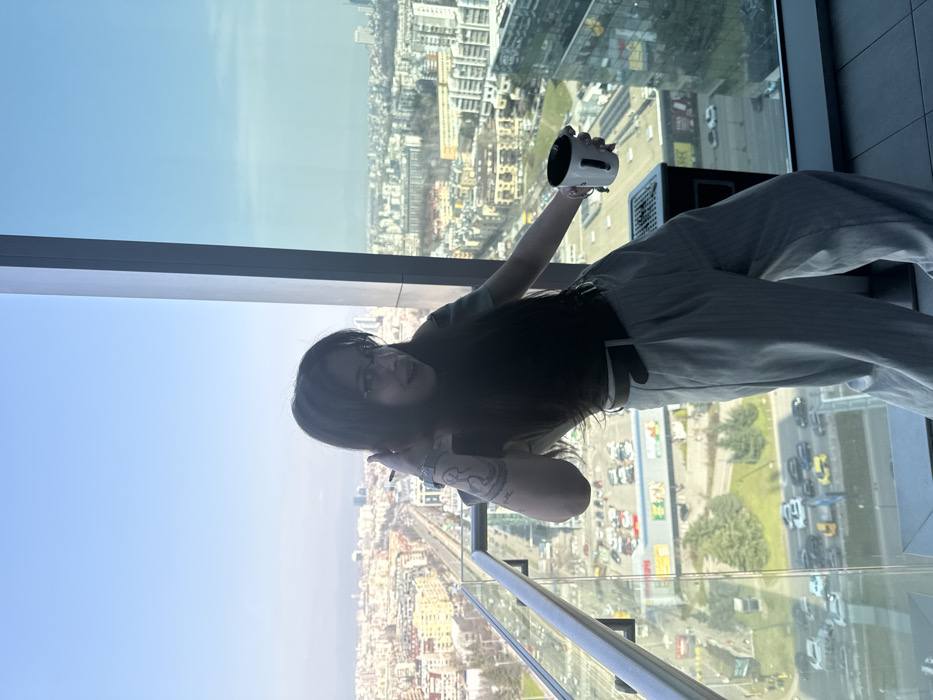 An indoor photograph taken from a high floor of a modern building provides a panoramic view of Sofia, Bulgaria. The location is consistent with an upper level of Capital Fort or Sky Fort, situated along Tsarigradsko Shose Boulevard, looking generally west-northwest over the boulevard and The Mall. A young adult female with long, dark hair and glasses stands in the foreground, facing the camera with a slight smile. She wears a dark short-sleeved top, light-colored pinstripe wide-leg trousers, and a dark belt. Her right hand is raised to her hair near her right ear, while her left arm is extended, holding a white and black mug. Tattoos are visible on her left upper arm and forearm. A small, dark, rectangular object rests on the floor next to her right leg. The subject is positioned against a floor-to-ceiling window, which features a glass balcony railing extending to the left. A dark vertical structural pillar is present on the right side of the frame. Beyond the window, the urban landscape of Sofia stretches under a clear blue sky. Below, Tsarigradsko Shose Boulevard is visible, featuring a tram line and vehicular traffic. In the midground, a large commercial complex, identifiable as The Mall, with a distinctive red roof section and a Fantastico supermarket at ground level, is prominent. The city's buildings extend to the horizon, with mountains (Vitosha) faintly discernible in the far distance to the left. A modern glass high-rise building is partially visible on the far right.
