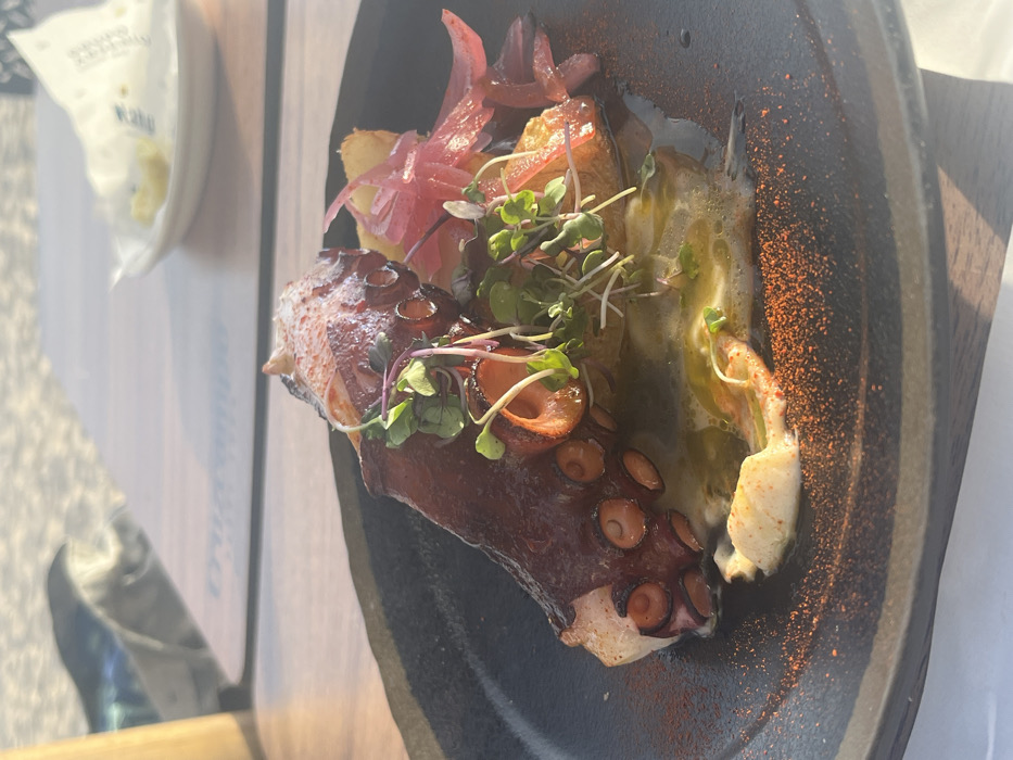 A black plate holds a vibrant culinary creation. Charred octopus tentacle, adorned with microgreens, rests alongside roasted potatoes and pickled red onions. A creamy, light-green sauce complements the dish. Paprika powder is sprinkled around the plate's rim. The arrangement is artful, suggesting a gourmet presentation. A paper napkin is next to the plate on a wooden table.
