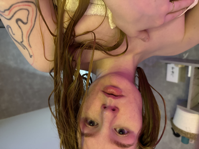 A head-and-shoulders portrait of a young Caucasian female is depicted indoors in Chaikovsky, Russia. The subject, with fair skin and light-colored eyes, possesses long, wet, reddish-brown hair draped over her shoulders. She is looking directly at the camera. Her upper torso is exposed, wrapped in a white towel. Her left hand, adorned with a thin metallic ring, rests upon the towel over her chest. A tattoo, comprising abstract black and red curvilinear lines, is visible on her left upper arm. The background features a grey, textured wall. To the left, a light-colored shelf supports a white woven basket and a smaller white object. The scene is illuminated by artificial lighting, casting distinct pink and yellow hues across the subject and the immediate environment.
