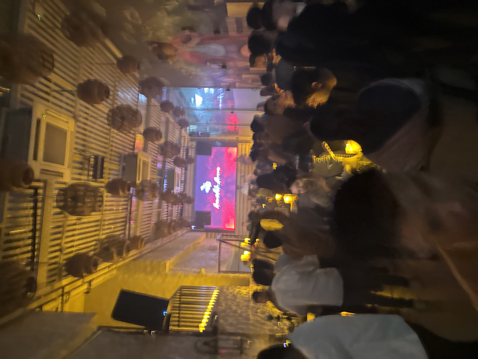 A blurry, low-angle shot captures a crowded outdoor event at night. People are seen mingling, illuminated by hanging lights. A large LED screen displays text and graphics, possibly related to the event. Decorative fixtures adorn the building walls, and structures resembling stairs or benches are visible in the foreground. The image suffers from significant motion blur, making details difficult to discern.
