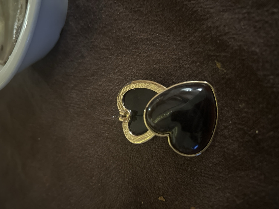 The image displays two heart-shaped earrings resting on a dark brown, textured textile surface. The foreground earring features a solid, dark brown to black polished surface with a thin gold-colored metallic border. Positioned slightly behind and above it is another heart-shaped earring with a black center and a wider, textured gold-colored metallic border. A single earring post extends from the top of the rear earring. In the upper right quadrant of the frame, a segment of a white ceramic bowl containing a light-colored, amorphous substance is partially visible. No individuals are present, and no actions or interactions are depicted. The environment is static. This scene is located in Puteaux, France.