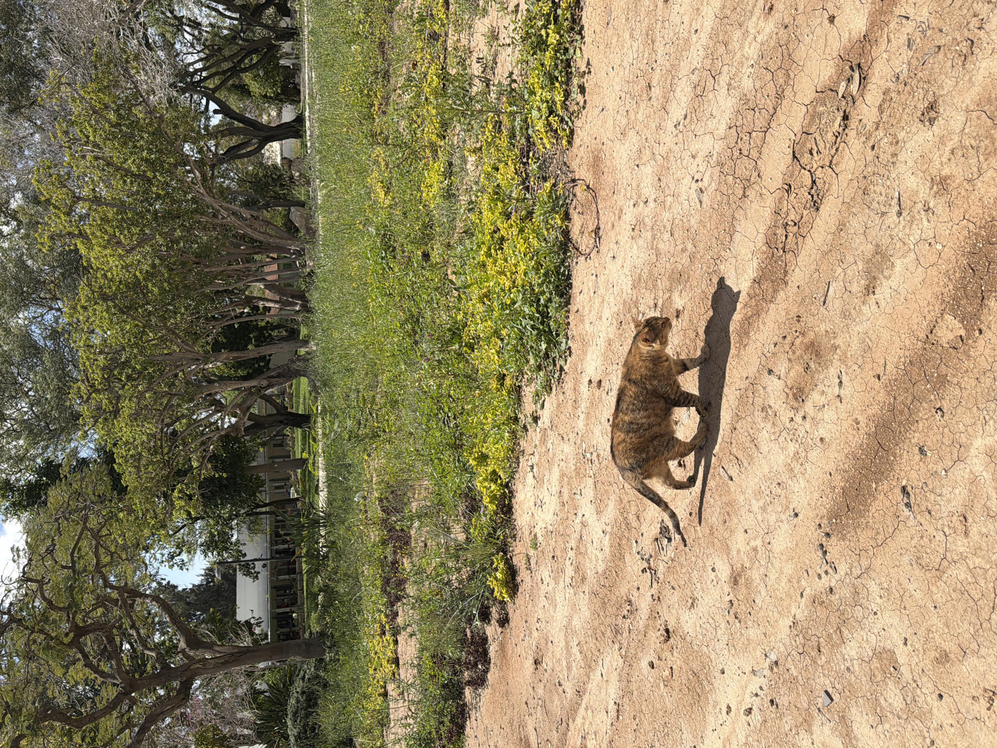 tabby cat standing on dry, cracked ground next to a strip of green vegetation. Trees and a building are visible in the background. The location is Eshkol Regional Council, Israel.