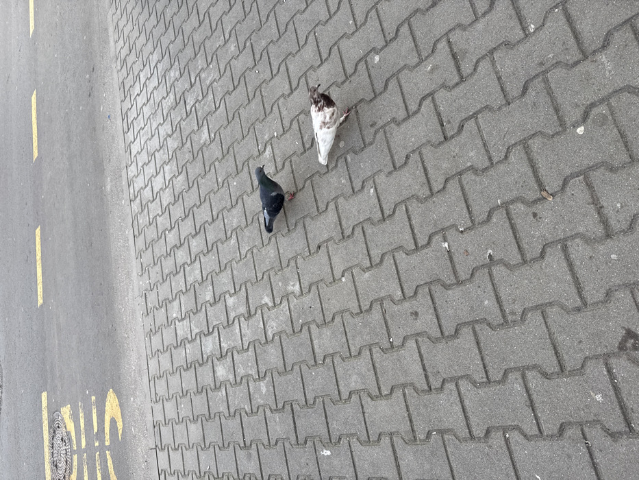 The image depicts an urban outdoor scene in Stara Zagora, Bulgaria. Two pigeons are observed on a grey interlocking paver sidewalk in the foreground. One pigeon is dark grey with visible red feet, positioned to the left. The second pigeon is predominantly white with brown mottled markings, positioned to the right of the first pigeon, also displaying red feet. Both pigeons face towards the right side of the frame. Beyond the sidewalk, an asphalt road is visible. Yellow dashed lines are painted horizontally on the asphalt. A partial yellow painted word or symbol, possibly "BUS," is visible on the left side of the road, adjacent to a circular metal manhole cover embedded in the asphalt. The sky is not visible, and no human figures are present.