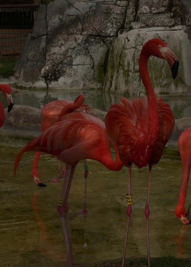 The scene shows a flock of red flamingos in an artificial pond