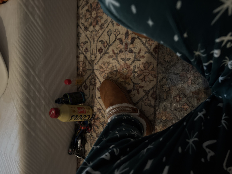 A foot in a brown slipper rests on a patterned rug beside a bed. Beside the slipper is a Coors bottle, a dark bottle, a small clear bottle with a red cap, and a set of keys. The person wearing the slipper is also wearing patterned pajamas. The bed has white linens.