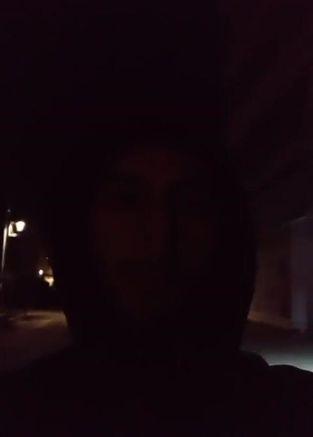 A person wearing a dark hooded garment is recorded by a camera looking toward them, illuminated by the faint street lights of the urban setting. The recording is taken at night.