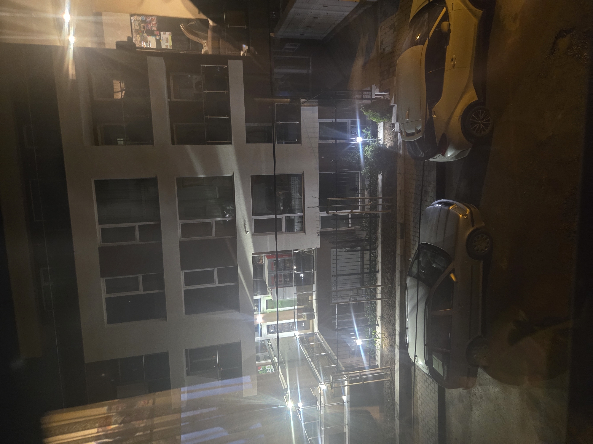 n exterior view of a modern apartment building at night in Sofia, Bulgaria. The building is multi-storied, with a facade of large windows. There are two cars parked along the side of the building. A white car is near the top of the image, while a silver car is parked further down. The ground level area of the building is enclosed by a metal fence. Illumination comes from streetlights or building lights, creating bright reflections in the windows and on the parked cars. The sky is not visible, and the overall impression is one of a quiet residential area at night.