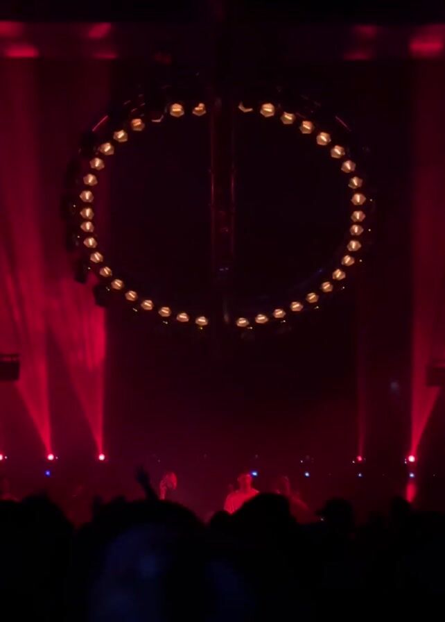 crowd of people at a concert, seen from behind. A large circular structure made of lights hangs above the stage. The lights change colors, flashing red, white, and yellow. The crowd is silhouetted against the bright lights, with some people raising their hands.