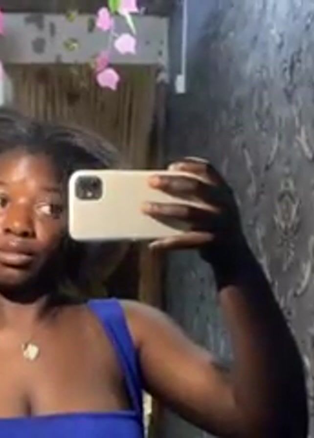 young woman in a blue tank top standing in front of a mirror. She is holding two phones, one pointed towards the mirror as if taking a selfie, and the other held up near her hair. Her hair is short and somewhat disheveled. The background includes decorative flowers and a wallpaper with a dark pattern. The room is illuminated, but not overly bright.