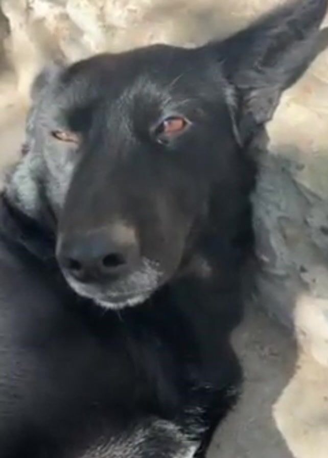 medium-sized black dog lying on a gray concrete surface. The dog has tan markings on its legs and a bit of white on its chest. It appears relaxed, and occasionally winks. A finger with a dark manicure briefly touches the dog's face near its eye. The scene is lit by sunlight with shadows. There are small yellow objects scattered nearby. Music plays throughout the video.