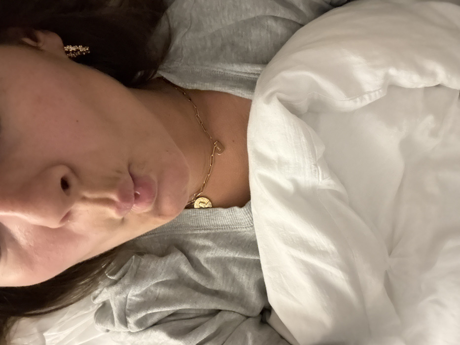 A woman lies in bed under white sheets, wearing a gray top. A delicate gold chain necklace with a small charm adorns her neck. Her dark hair is visible near her ear, where a sparkly earring catches the light. Her face is partially visible, showing her nose, lips, and cheek. The scene is relaxed and intimate.