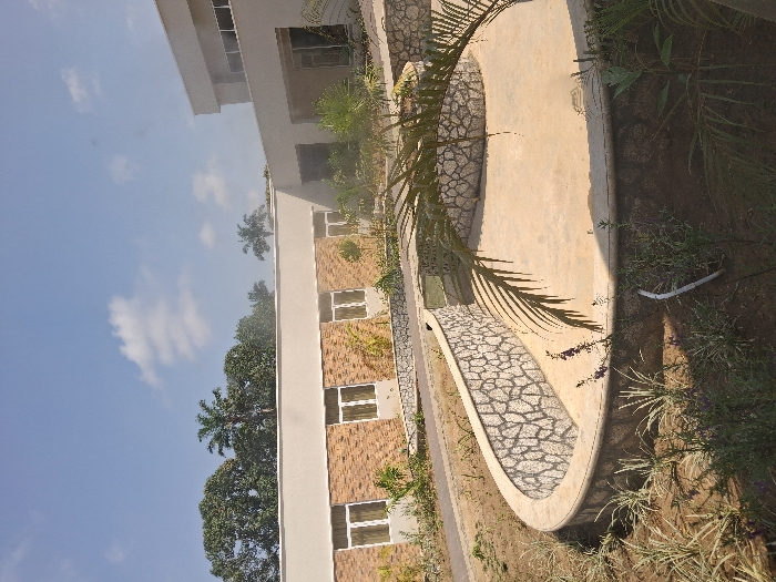 This image depicts an outdoor landscaped area with architectural structures in Takum, Nigeria, under a clear sky with scattered white clouds