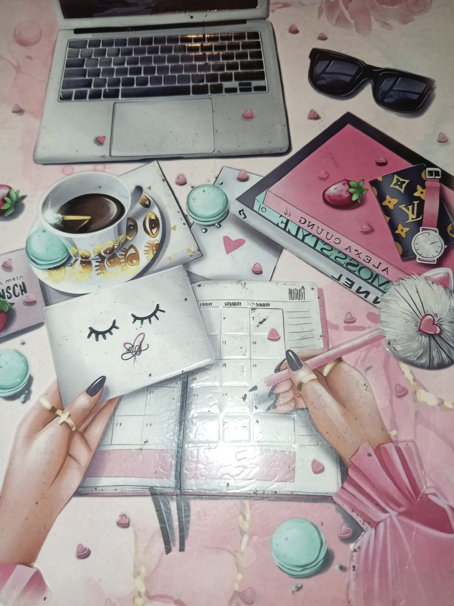 This artistic illustration, set in Parroquia Ocumare, Venezuela, depicts a stylized overhead flat lay composition of various items on a pink-hued surface. In the upper left quadrant, a silver-toned laptop with a visible keyboard and trackpad is positioned. Scattered around the laptop and across the surface are numerous small, three-dimensional pink heart shapes. To the upper right, a pair of black, rectangular sunglasses rests above a stack of three books, one with a prominent pink spine displaying reversed text including "ALEXA CHUNG" and "MOSSMAN". A red strawberry illustration is centered on the top book. Adjacent to the books, a black and yellow patterned item, suggestive of a luxury brand purse or wallet, is depicted with a pink strap and a silver wristwatch. Centrally positioned on the left, a white cup filled with dark liquid, consistent with coffee, rests on a decorative saucer featuring gold and brown eye motifs. Two light blue macarons are placed near the cup, with additional macarons visible in the lower right and mid-left areas. In the foreground, two illustrated light-skinned female hands are prominent. The left hand, adorned with a gold-colored ring on the ring finger and dark nail polish, holds a closed white notebook or cover illustrated with closed eyelashes and red lips, including the text "Sigal". The right hand, also with dark nail polish, holds a pink pen featuring a white fluffy pom-pom. This hand is posed as if marking an open calendar or planner, which displays "AUGUST" at the top right and a grid with "FRIDAY" and "SATURDAY" visible. A partially visible item on the far left contains the text "IST MEIN WUNSCH". The background surface is a soft pink, exhibiting subtle, indistinct patterns.