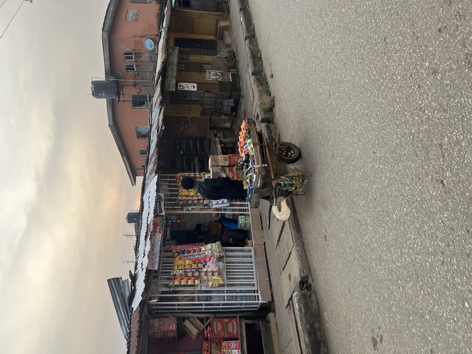 A street scene shows a small roadside shop, its shelves stocked with snacks and goods. A person stands inside the shop, likely a vendor. Next to the shop, a cart displays additional items for sale, including produce. The buildings are old and worn, with corrugated metal roofs. A narrow street stretches into the distance. The sky is overcast, creating a muted, grayish light. A water tank is visible atop one of the buildings.