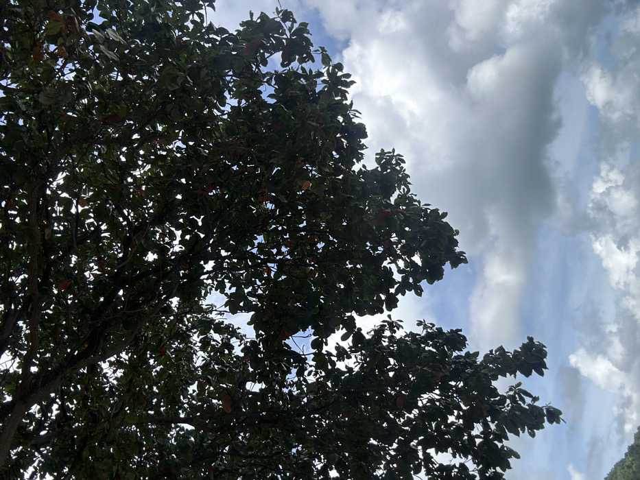 - "Looking up through the branches of a dense tree, the sky is filled with a mix of blue patches and puffy gray clouds" by FM-S4vcm1, licensed under CC BY 4.0