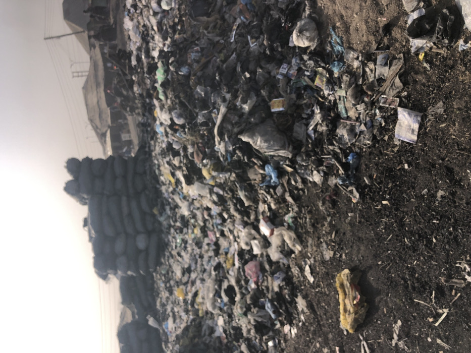 The image displays an extensive accumulation of mixed refuse in an outdoor setting within the city of Bukuru, Nigeria
