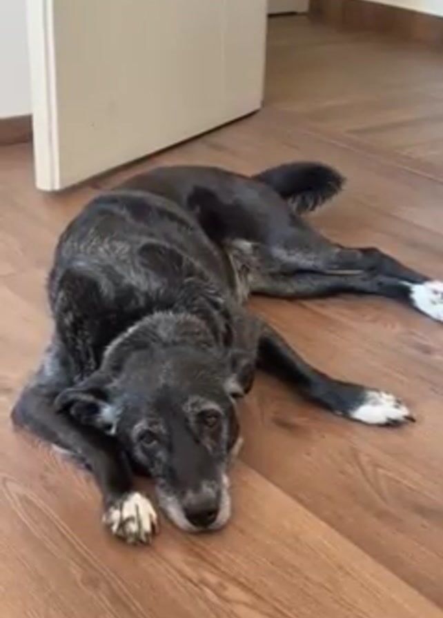 A static, eye-level shot captures a medium-sized dog lying on a wooden floor. The dog has predominantly black fur, with patches of gray especially around its face and shoulders. Its paws are white. The dog is lying in a relaxed position with its legs extended. Its head is resting on the floor. The dog appears to be looking at the camera. The floor is made of wood-patterned tiles. Behind the dog, a partially opened white door is visible. A voice in the background says, "Cora, que onda, mi amor."