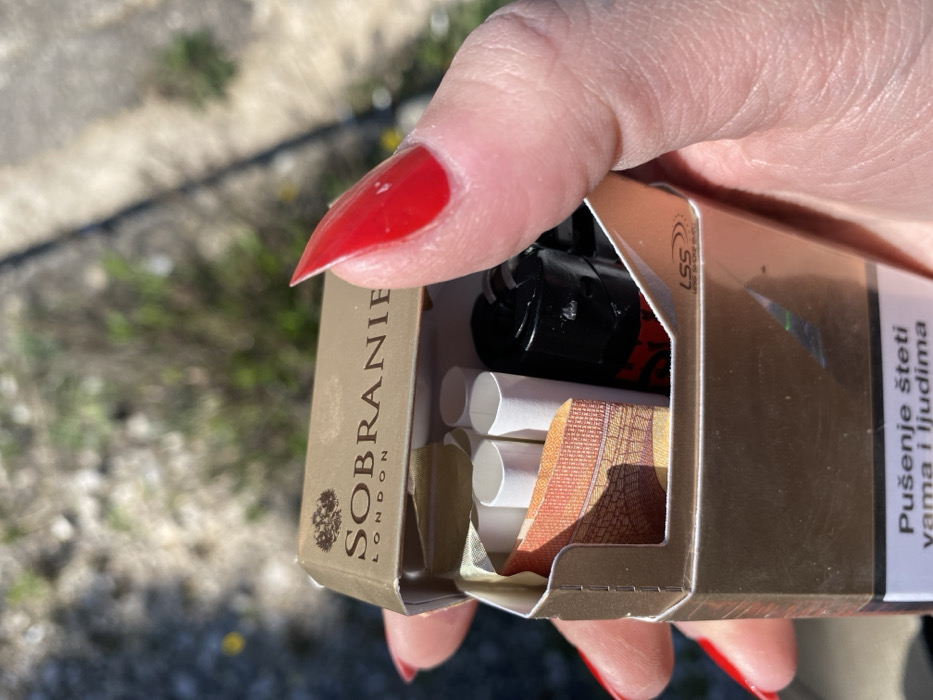 A close-up image depicts a person's hand holding an open gold-colored pack of "SOBRANIE LONDON" cigarettes outdoors in Kunje, Montenegro