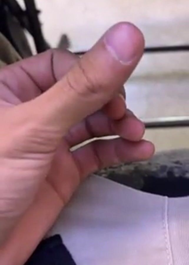 A close-up shot shows a hand opening. The hand starts with the thumb tucked against the palm, then extends the thumb to form a 'thumbs up' gesture, before extending the remaining fingers to form an open hand. The hand rests on a light-colored fabric. A chair frame is visible in the background.