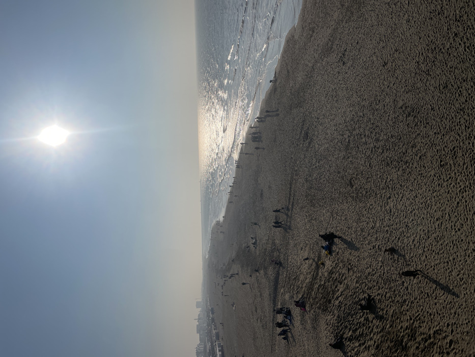 An elevated, wide-angle photograph captures Scheveningen beach in The Hague, Netherlands, under clear skies. The sun, positioned high in the upper center, generates significant glare and reflects intensely off the North Sea, creating a shimmering path of light across the water's surface towards the sandy shore. The sea exhibits moderate wave activity. The expansive, light brown sand beach is populated by dozens of individuals scattered across its width and length. Most figures appear as dark silhouettes due to the sun's position, casting long shadows generally towards the viewer. Observed actions include individuals walking along the waterline and further back on the dry sand. Multiple small groups are visible, with some people seated or lying on the sand, particularly in the foreground where minor undulations and sand mounds are present. In the far left background, a hazy urban skyline consisting of multi-story buildings is visible along the coastline, interspersed with temporary white beach structures. Towards the right-mid distance, a long pier or breakwater extends into the sea. The image is taken from an elevated vantage point, looking down and along the coastline.
