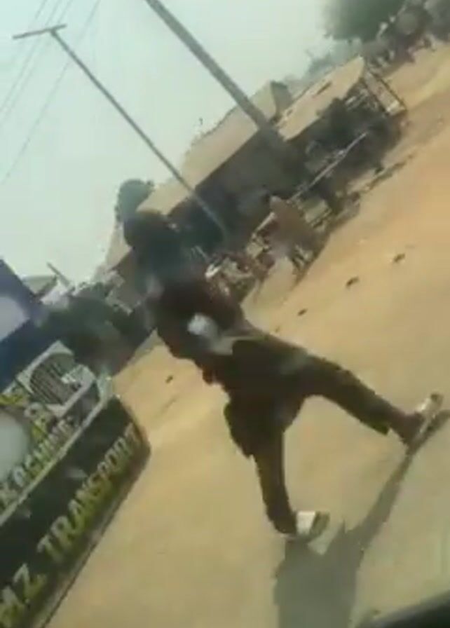 The video, shot from inside a car, depicts an outdoor scene. The car is in motion, passing by a roadside market or commercial area with simple, possibly temporary, structures. People are seen walking about. The car passes close to two large trucks, one with a blue bed and the other with a green tarp covering the cargo. Several men in traditional clothing stand on the side of the road. The environment seems dusty and somewhat disorganized.