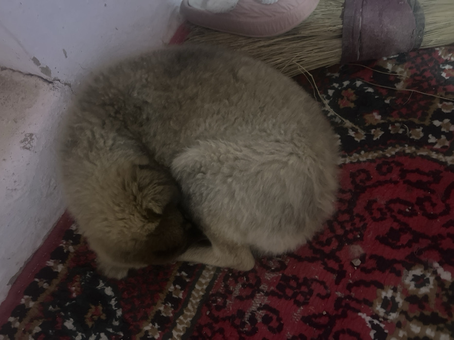 A tan, furry dog is curled up, its head tucked towards its hindquarters, appearing to be asleep. The dog rests on a red rug patterned with dark floral designs. Adjacent to the dog, a small broom leans against a white wall. A pink slipper and a cylindrical object are visible near the top of the frame, resting on the broom.