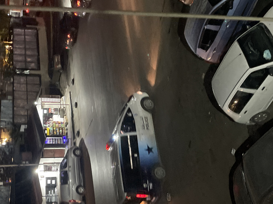 An aerial perspective captures a city street at night. The illuminated storefronts of a small shop cast light on the pavement. Parked cars line the street, with a white police vehicle prominently displayed with its lights flashing. The composition is slightly tilted, giving a dynamic feel to the scene.