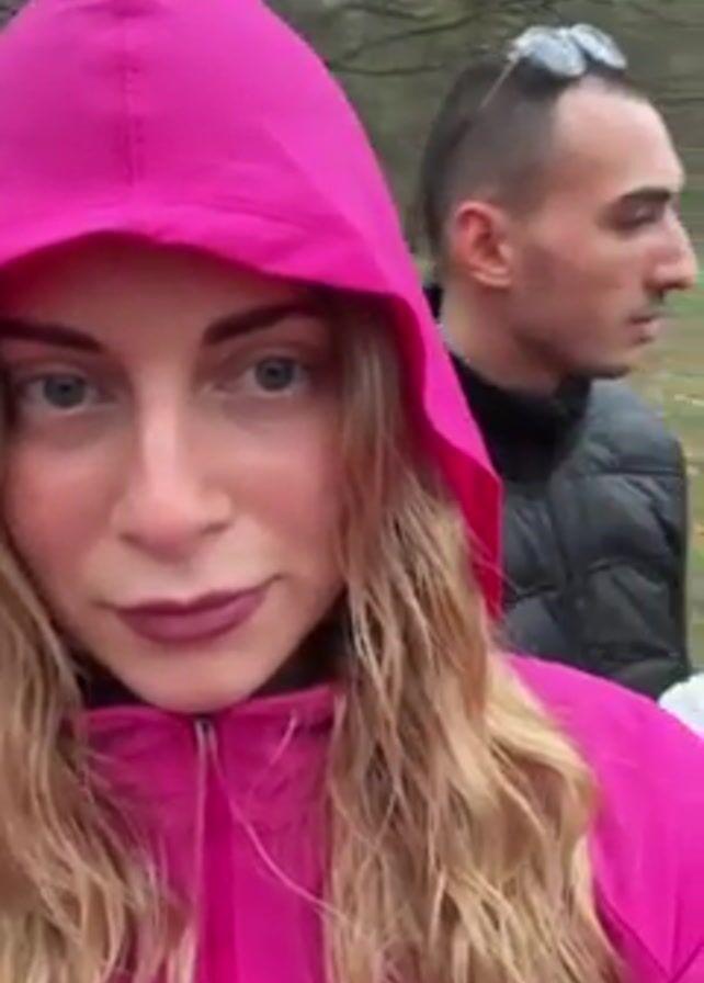 A woman in a pink hooded jacket faces the camera. She has long blonde hair and wears dark lipstick. A man in a black puffer jacket stands behind her, slightly out of focus. They are in a wooded area, possibly a park. The ground is covered in dead leaves. An animal sound, like a dog barking or growling, is heard. The woman briefly makes a puckered face.