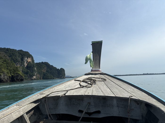 The image depicts a forward-facing perspective from the bow of a wooden longtail boat navigating coastal waters near Ao Nang, Thailand