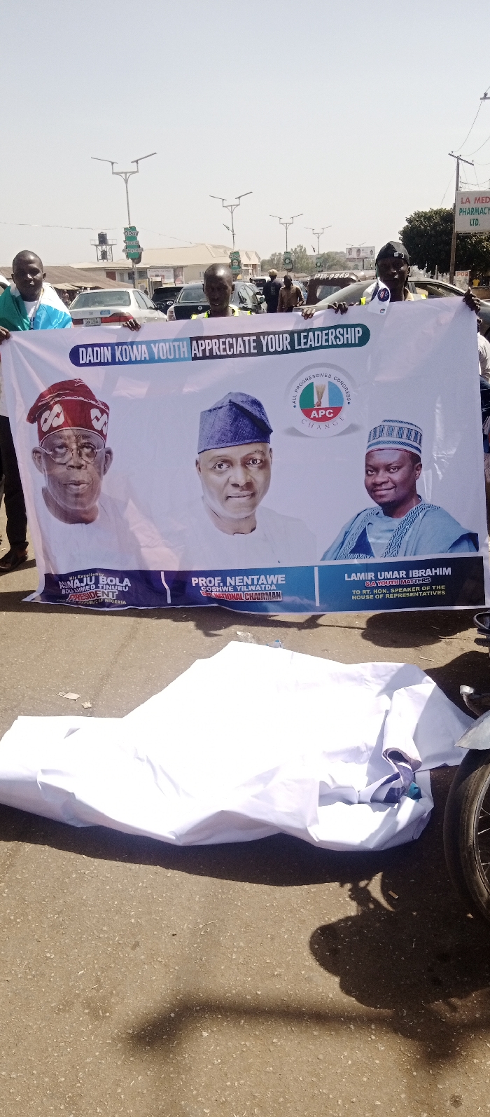 An outdoor, daytime image captures a political banner held by at least four adult males across what appears to be a paved road in Jos, Nigeria