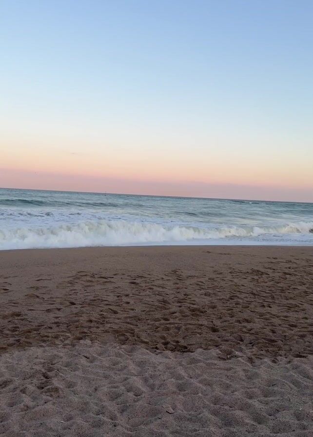 beach with brown sand and waves rolling in from the ocean. The sky is a gradient of blue, pink, and light yellow, suggesting it might be near sunrise or sunset. There are no people visible in the frame. The sand appears undisturbed except for scattered small impressions. The waves are foamy and white as they break near the shoreline. The scene is still and peaceful.