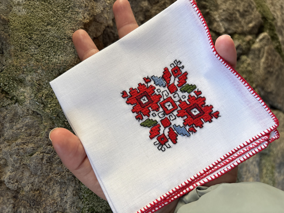 - "A light-skinned hand, likely the left, holds a folded white textile featuring cross-stitch embroidery against an out-of-focus stone background in Plovdiv, Bulgaria" by FM-J2O7t2, licensed under CC BY 4.0