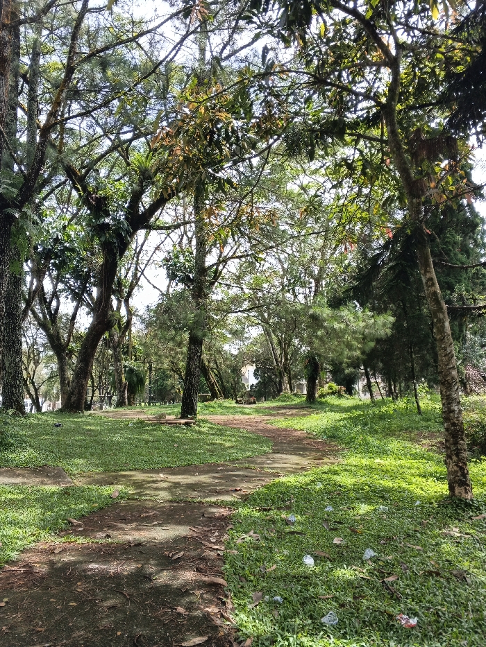 A lush, green park scene unfolds with a winding concrete pathway. Tall trees frame the view, their branches forming a dense canopy overhead. Sunlight filters through the leaves, dappling the ground with light and shadow. The grass is thick and verdant, with a scattering of debris. The pathway leads the eye into the distance, hinting at the park's expanse.