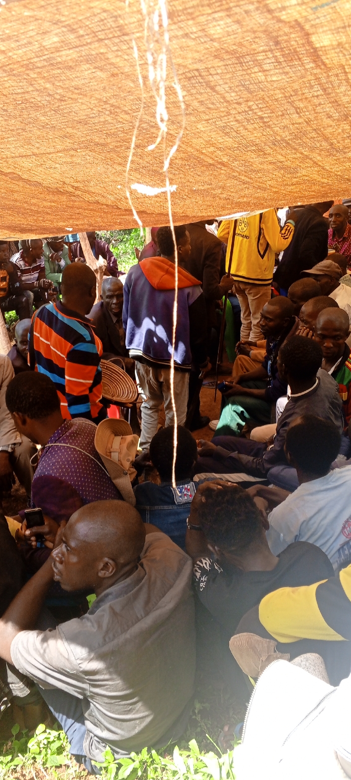 A gathering of diverse individuals is depicted, likely an event or meeting. The subjects are seated and standing under a brown tent-like structure. Clothing styles vary, showcasing a mix of casual and formal attire. Some faces are visible, displaying a range of expressions. The atmosphere appears relaxed and informal, with individuals engaging in conversations and observation. The environment suggests a rural or semi-rural setting, with vegetation visible near the seating area.