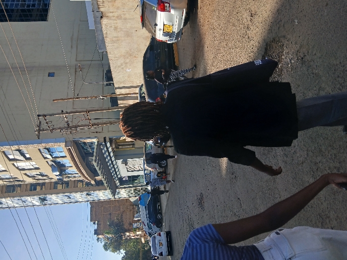 The scene depicts an unpaved urban street in Thika Township ward, Kenya, under clear daylight conditions. The ground is a mix of dirt and gravel. In the immediate foreground on the left, the partial view of an individual's left arm and shoulder is visible, clad in a blue and white striped shirt and light-colored trousers. Centrally in the mid-foreground, an individual with brown dreadlocks walks away from the camera, wearing a dark blazer and light grey trousers, carrying a dark bag over their left shoulder. Further down the street, several other pedestrians are observed walking. Numerous vehicles are parked along both sides of the road, including a silver SUV with a Kenyan license plate beginning 'KCQ' on the far right. The background is dominated by a tall, multi-story building featuring a modern glass and beige facade, with a prominent entrance canopy. An older, reddish-brown building is partially visible to the left of the main structure. Multiple utility poles with numerous overhead wires traverse the scene, and a concrete wall borders the right side of the street.
