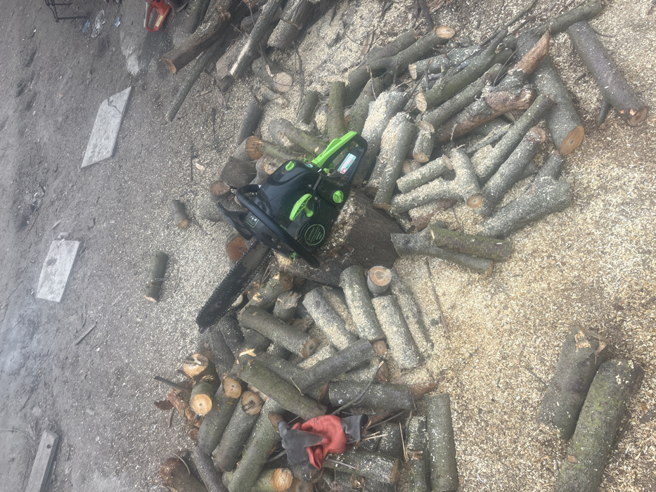 The scene is an outdoor area in Harlets, Bulgaria, covered extensively with light-colored wood sawdust, dirt, and gravel. A black and green chainsaw is centrally positioned, resting on a large, cut log section. Its black guide bar and chain are visible, extending towards the left. Surrounding the chainsaw and covering much of the ground are numerous cut logs and branches, varying in length and diameter, appearing recently processed based on the fresh cut ends and surrounding sawdust. The logs exhibit greyish-green or dark bark. A pair of red and black work gloves is visible on a pile of logs in the lower left quadrant of the image. In the background, two flat, light-colored rectangular objects, possibly planks or concrete slabs, lie on the ground. A partial view of a red chainsaw is discernible in the upper right background. No individuals are present in the frame. The environment indicates active or recently completed wood cutting operations.