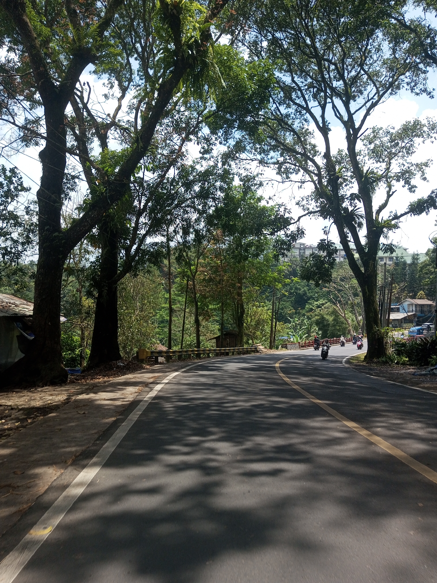 A black asphalt road with a yellow centerline curves through a forested area. Tall trees line both sides of the road, casting shadows on the pavement. A white line marks the edge of the road on the left. Motorbikes are visible in the distance on the road, traveling away from the viewer. A guardrail is present on the left side of the road in the background. In the distance, buildings are visible on a hillside amongst the trees. The sky is partly cloudy. This scene is located near Kioumaknao 2, Laos.