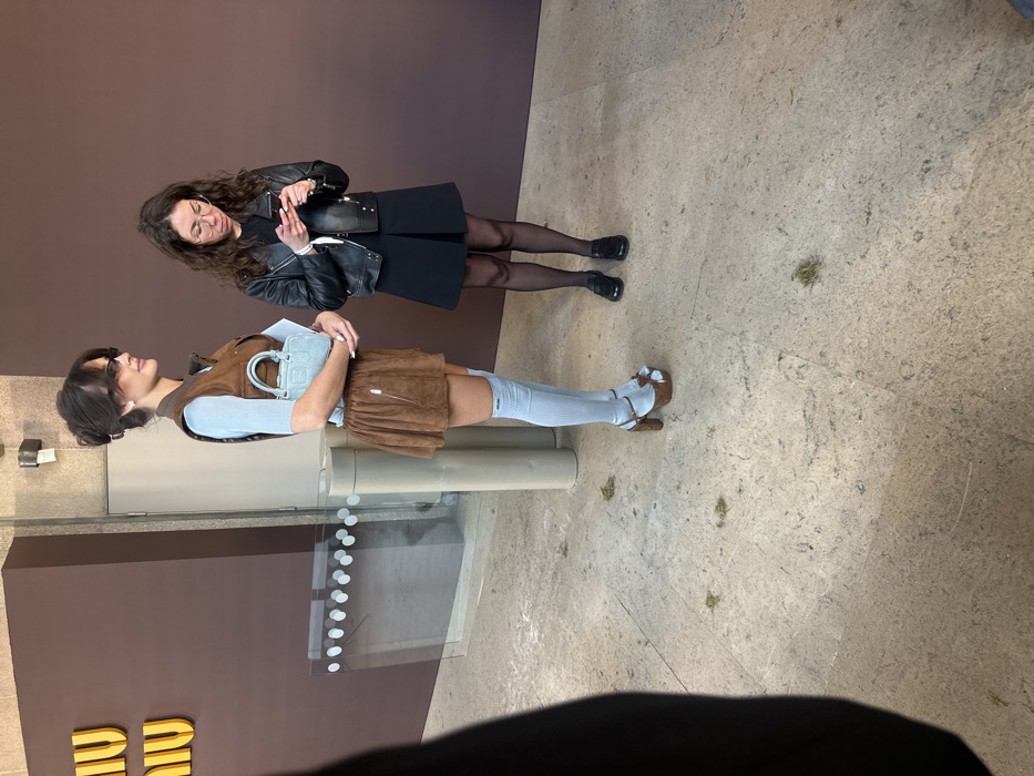 The image depicts an outdoor scene at the Palais d'Iéna in Paris, France, identifiable by the distinctive brown building facade and prominent yellow "MIU MIU" lettering. Two women stand in the foreground against the brown wall. The woman on the left, positioned centrally, is tall with dark hair styled in an updo and wears dark sunglasses. She is dressed in a light blue short-sleeved top, a brown sleeveless vest with pockets, a brown mini-skirt, light blue knee-high socks with visible "MIU MIU" branding, and brown platform high-heeled sandals with white accents. She holds a light blue Miu Miu handbag in her left hand and looks towards the viewer's left. To her right, a second woman with curly dark hair and glasses wears a black leather jacket over a black dress or skirt, black sheer tights, and black loafer-style shoes. She is looking down, focused on a smartphone held in both hands. A partial, dark figure is visible on the far left, obscuring a small portion of the scene. The background features a flat, dark brown wall, with a light grey door visible to the right of the "MIU MIU" sign. In front of the wall, a clear glass barrier with white circular markings along its top edge stands before two cylindrical light grey bollards. The ground is composed of textured, light-colored flagstones or concrete, sparsely dotted with small clumps of green plant matter. The scene is brightly lit by natural light, casting subtle shadows.