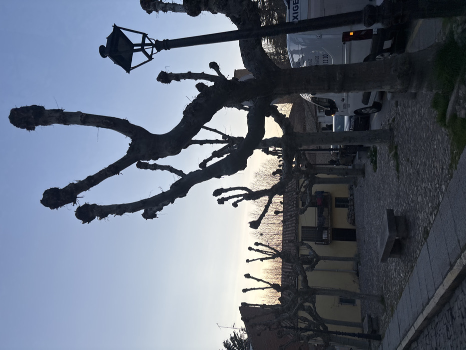 The image displays a street scene in Ávila, Spain, at dusk. The foreground features a grey cobblestone square or street on the right and a stone sidewalk on the left, where a rectangular stone bench is centrally positioned. A row of heavily pollarded deciduous trees, bare of leaves and possessing thick, gnarled trunks with stubby branches, dominates the scene, silhouetted against the sky. On the far right, a black, traditional-style streetlamp with a square lantern top stands upright. In the midground, a pale yellow, two-story building with a red-tiled roof and a small black-railed balcony is visible on the left. Behind the trees on the right, a white van with "OXIGEN" and the Spanish text "Instalaciones Sanitarias 911 11 10" on its side is parked or moving, along with other partially visible vehicles. The background reveals additional bare trees against a clear sky that transitions from light blue overhead to a pale orange-pink hue near the horizon. No individuals are clearly discernible within the scene, which appears static.