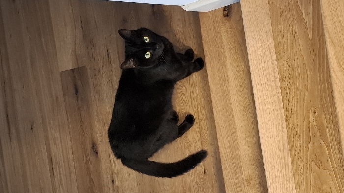 The image displays a black domestic cat with luminous green eyes, standing indoors in Elvange, Luxembourg