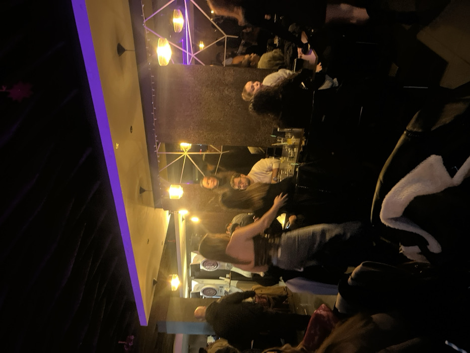 Inside a dimly lit venue, people are gathered around tables, some standing and interacting. Mirrored panels on the wall create a sense of depth, reflecting the scene and the hanging light fixtures. A purple strip runs along the top of the wall, adding a vibrant accent. The lighting casts a warm glow on the faces and objects in the room, while the foreground is shrouded in shadow.