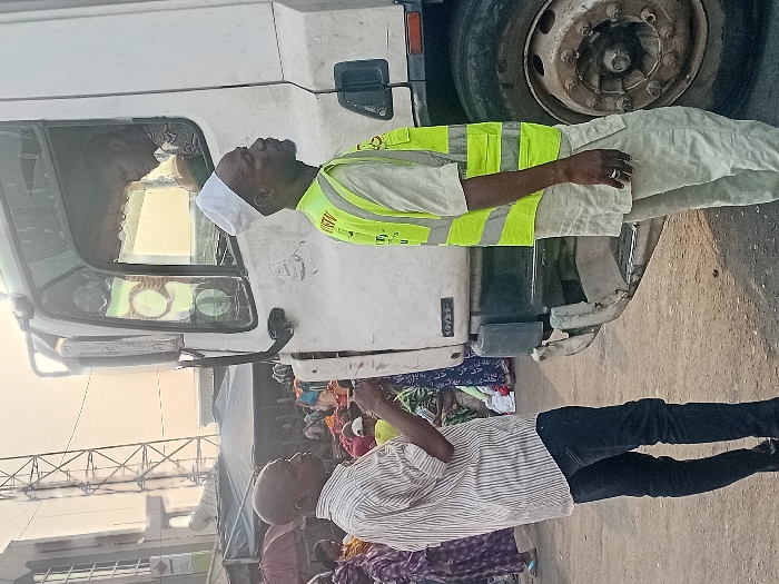 Two men stand outdoors next to a white truck. One man wears a white kufi, a bright yellow vest with reflective stripes, and light-colored pants. He faces the truck's cabin, where another man is visible inside. The second man wears a horizontally striped shirt and dark pants. He faces the man in the vest, seemingly in conversation. Other people and fabric items are in the background.