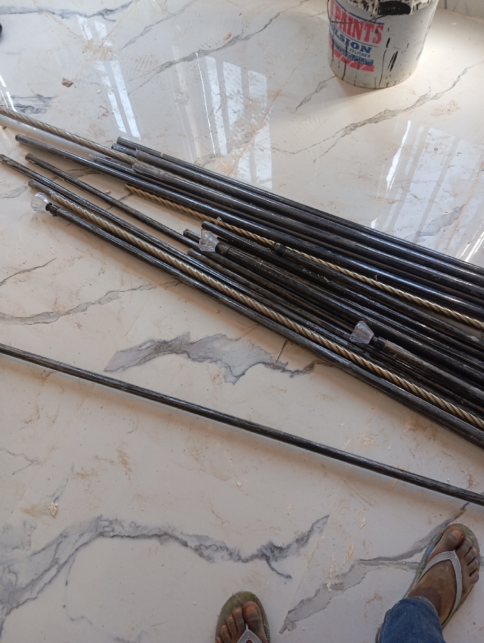 The image displays a close-up, downward perspective of a light-colored, marble-patterned tiled floor with reflective properties, indicating an overhead light source. A cluster of approximately 25-30 dark, slender items resembling metal rods or wire ropes, some featuring visible coiled strands and clear plastic end caps, is laid diagonally across the central and right portions of the frame. In the upper right quadrant, a white plastic bucket, stained with paint and bearing the labels "PAINTS" and "EMULSION 20 LITRES" in blue and red text, rests on the tiled surface. Scattered debris is visible across the floor. At the bottom of the frame, the feet of an individual, wearing light grey flip-flops, are present. The right foot is partially covered by blue denim material. The scene is located in DU, Nigeria.