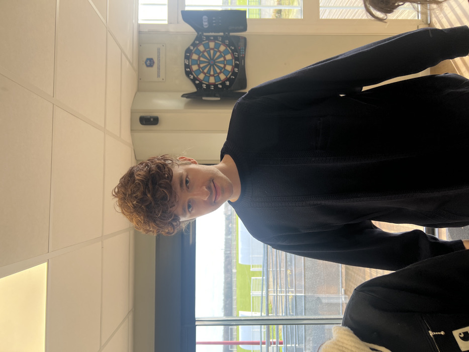 An indoor scene in Raimbeaucourt, France, features a male individual positioned centrally, looking towards the viewer with a slight smile. He has curly, reddish-brown hair and is wearing a dark blue or black long-sleeved sweater with vertical textured patterns and a left chest pocket. To his lower left, a portion of another person's arm and a white-collared black jacket are visible. Behind and to the right of the primary subject, a traditional dartboard enclosed in an open dark cabinet is mounted on a light-colored wall. Above the dartboard, a rectangular blue plaque displaying a coat of arms or emblem is affixed. Large windows to the left and rear of the subject reveal an outdoor sports field with green grass, bordered by a white railing system, and distant white covered structures and a red pole. The interior space has a dropped ceiling with white acoustic tiles and a recessed light fixture. The lighting indicates daytime.