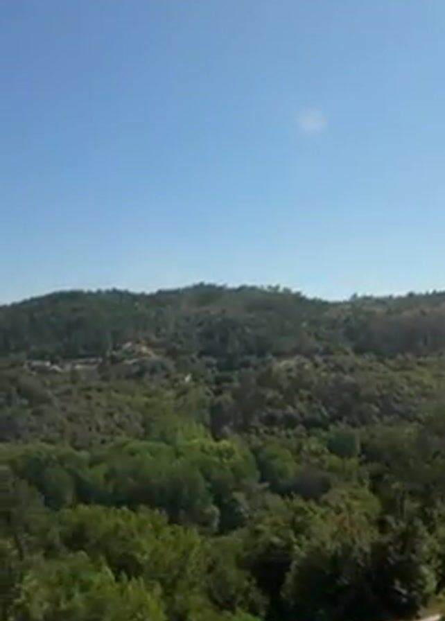 The camera captures a view of a lush, green hilly landscape under a clear blue sky. As the camera moves, trees and foliage fill the frame, obscuring the distant hills. The scene appears to be shot from a moving vehicle, such as a car or train.