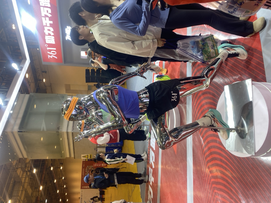 The image depicts a silver mannequin in a running pose at a trade show in Qingdao, China (36