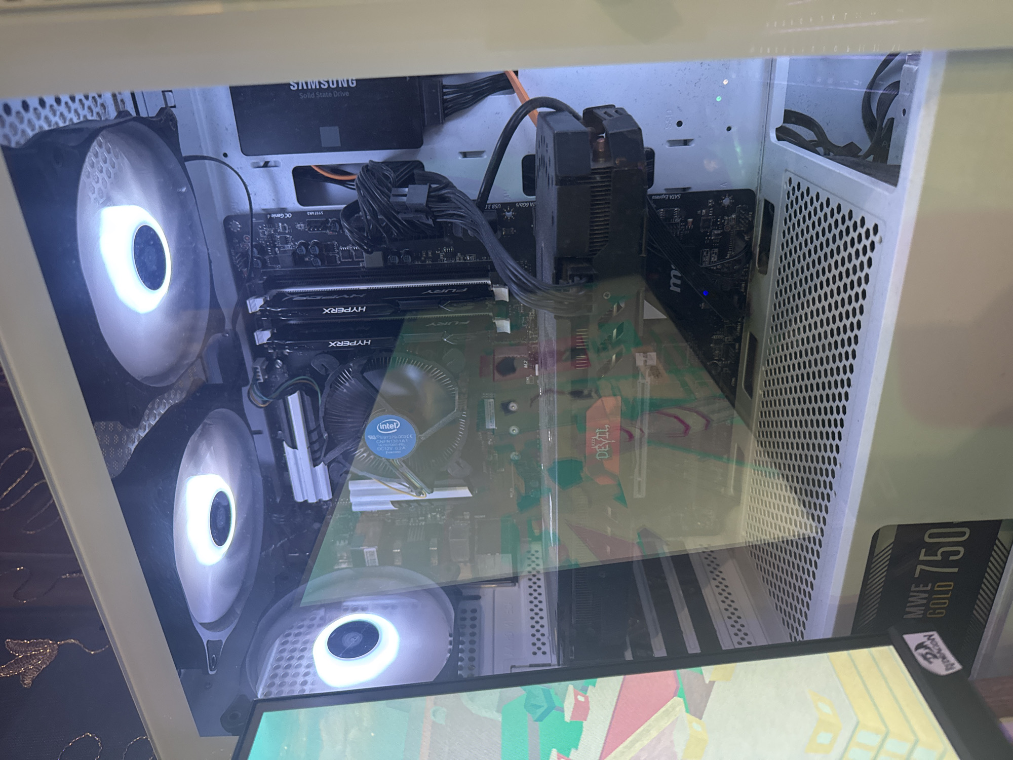 inside of a computer case. The components visible include a motherboard, CPU cooler with an Intel logo, RAM sticks labeled "HYPERX", a graphics card labeled "DEVIL", a Samsung solid state drive, case fans with white LEDs, and a power supply labeled "MWE 750 GOLD". The computer case is white and partially visible through the glass side panel. There is also some of the background visible.