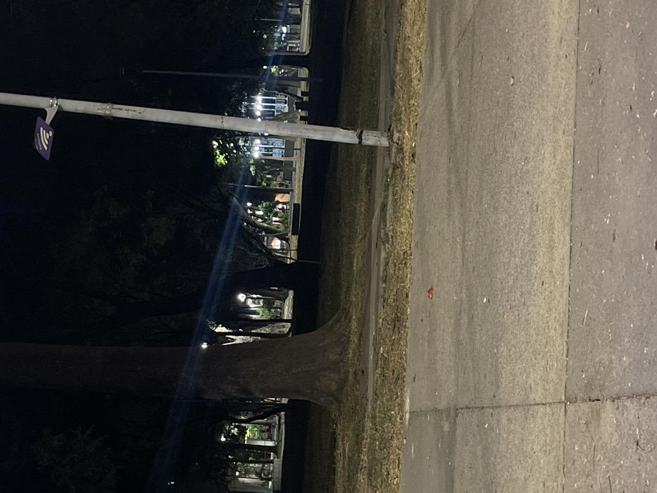 A nighttime scene depicts a street and adjacent grassy area. On the left, trees obscure a structure with illuminated windows. A metal pole extends vertically, displaying a small, purple wifi sign. The right side shows a concrete street with visible seams and occasional debris. The overall lighting is dim, with artificial lights creating highlights in the distance.